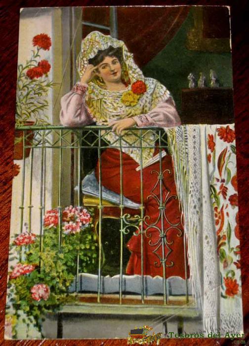 ANTIGUA POSTAL DE MUJER EN EL BALCON - NO CIRCULADA - ILUSTRADA POR LUIS DEL AGUILA.