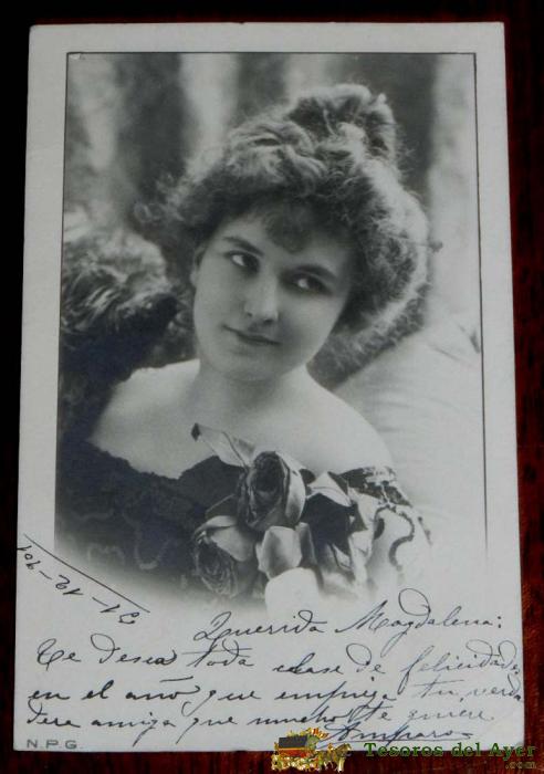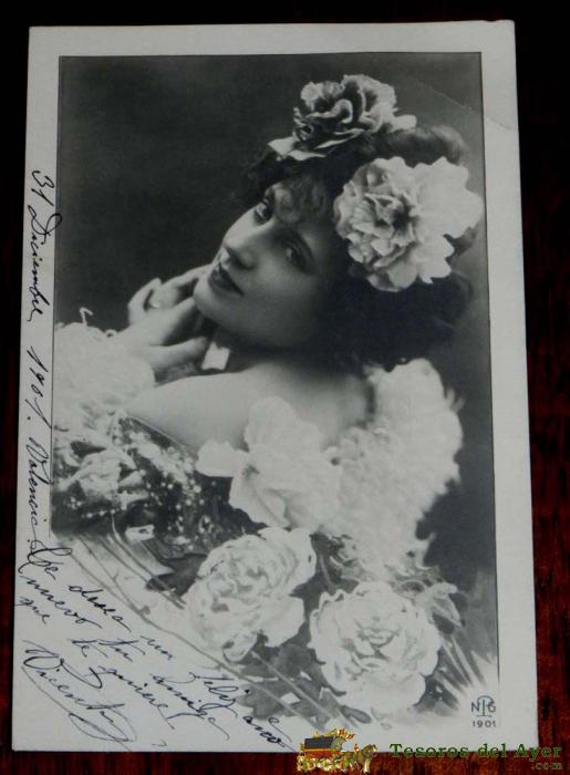 ANTIGUA FOTO POSTAL DE MUJER CON FLORES, NPG 1901, MODERNISTA, ART NOUVEAU, CIRCULADA EN 1902, SIN DIVIDIR