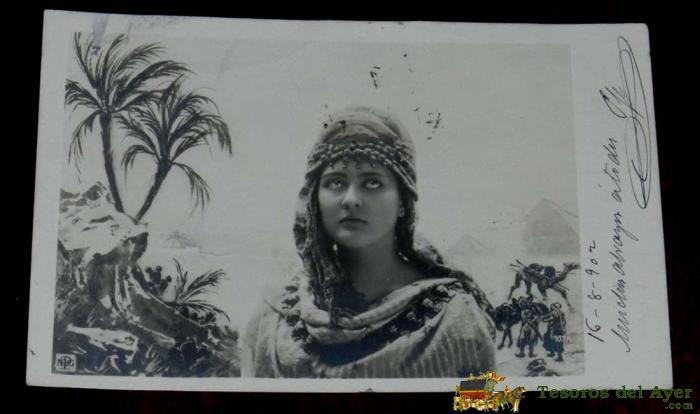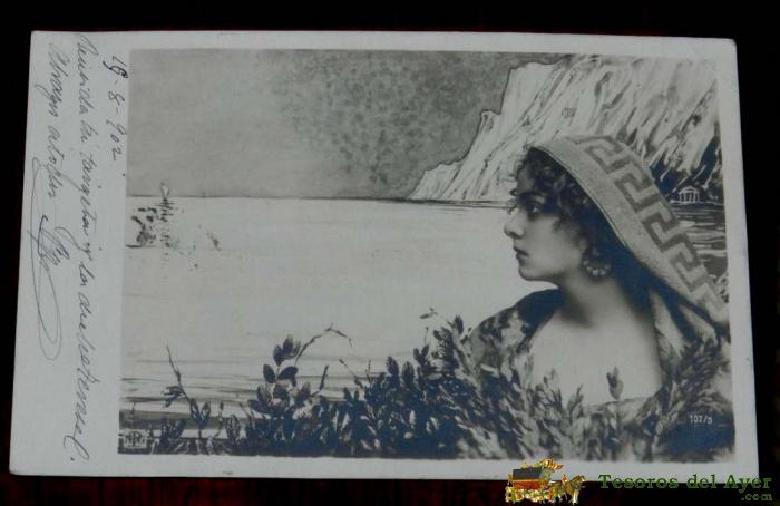 ANTIGUA FOTO POSTAL DE MUJER ORIGINAL, MODERNISTA, ART NOUVEAU, CIRCULADA EN 1902, SIN DIVIDIR.
