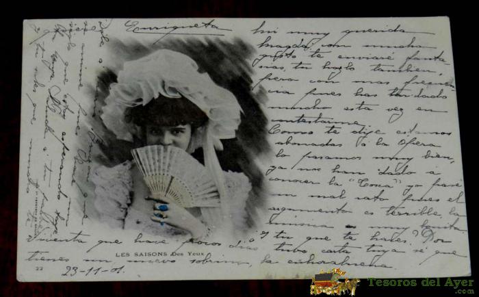 ANTIGUA POSTAL DE MUJER JUEGO DE OJOS, LES SAISONS DES YEUX, 22 CIRCULADA EN 1902 SIN DIVIDIR