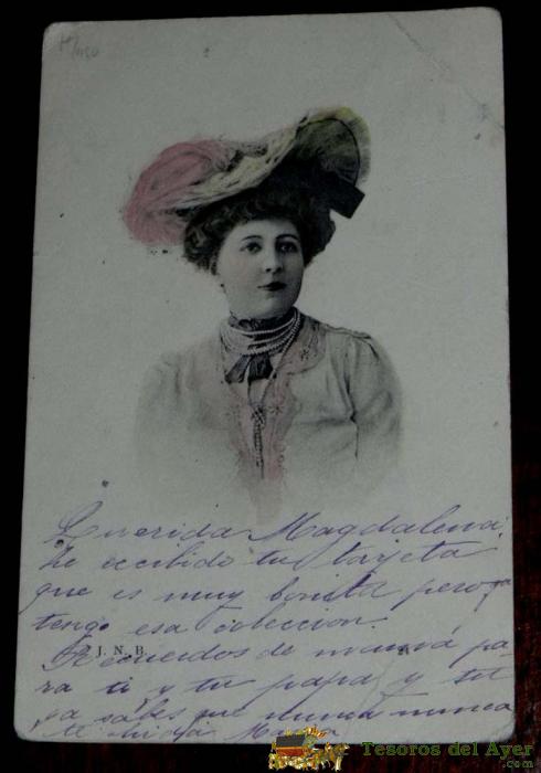 ANTIGUA POSTAL DE DAMA, J.N.B. CIRCULADA EN 1902, SIN DIVIDIR