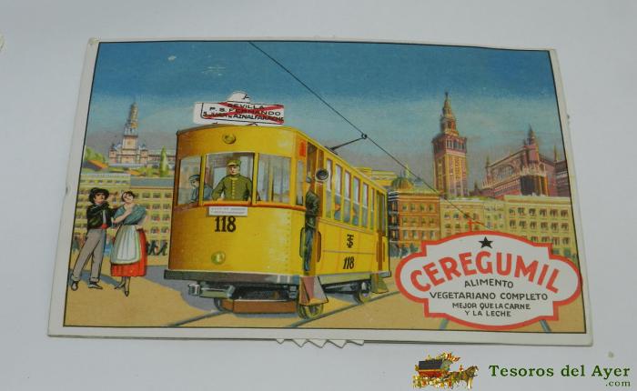 POSTAL PUBLICITARIA DE CEREGUMIL, TRANVIAS DE SEVILLA, ED. J. GARZON, NO CIRCULADA, REVERSO CON LA GUIA DE LAS LINEAS Y PRECIO DE LOS TRAYECTOS.