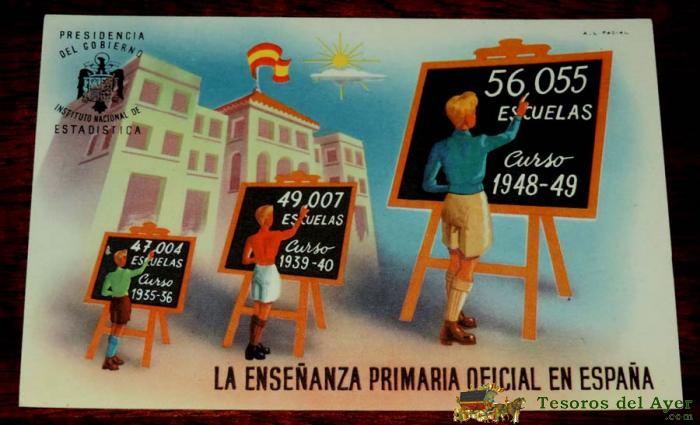POSTAL DEL INSTITUTO NACIONAL DE ESTADÍSTICA, LA ENSEÑANZA PRIMARIA EN ESPAÑA, E, I.G. VALVERDE, NO CIRCULADA.