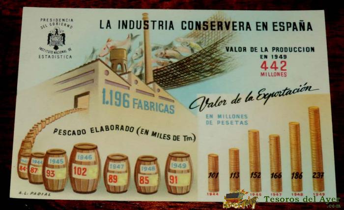 POSTAL DEL INSTITUTO NACIONAL DE ESTADÍSTICA, LA INDUSTRIA CONSERVERA EN ESPAÑA, E, I.G. VALVERDE, NO CIRCULADA.