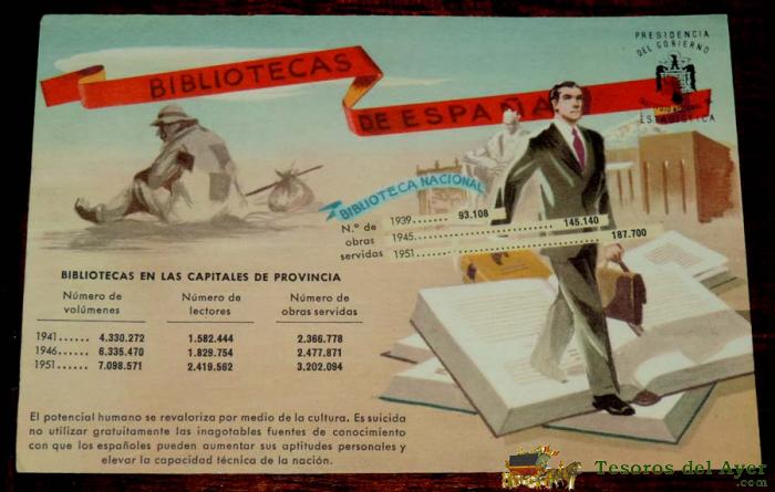 POSTAL DEL INSTITUTO NACIONAL DE ESTADÍSTICA, BIBLIOTECAS DE ESPAÑA, E. I.G. VALVERDE, NO CIRCULADA.