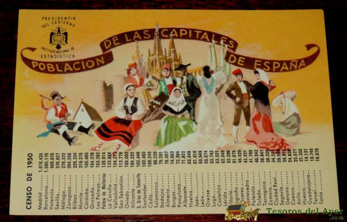 POSTAL DEL INSTITUTO NACIONAL DE ESTADÍSTICA, POBLACION DE LAS CAPITALES DE ESPAÑA, CENSO DE 1950, E. I.G. VALVERDE, NO CIRCULADA.