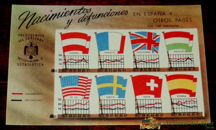 POSTAL DEL INSTITUTO NACIONAL DE ESTADÍSTICA, NACIMIENTOS Y DEFUNCIONES EN ESPAÑA Y OTROS PAISES, E. I.G. VALVERDE, NO CIRCULADA.