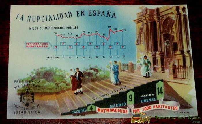 POSTAL DEL INSTITUTO NACIONAL DE ESTADÍSTICA, LA NUPCIALIDAD EN ESPAÑA, AÑO 1947, E. I.G. VALVERDE, NO CIRCULADA.