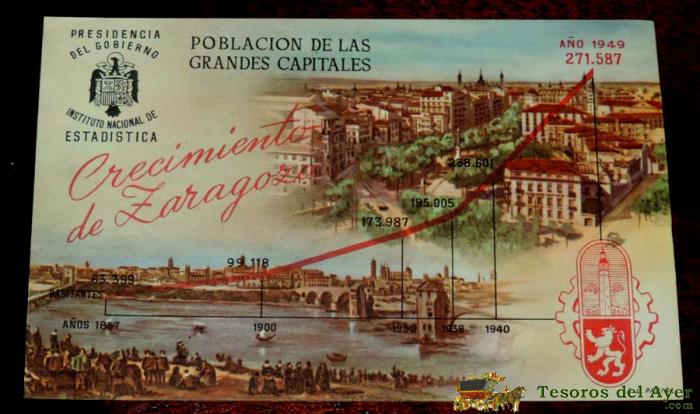 POSTAL DEL INSTITUTO NACIONAL DE ESTADÍSTICA, POBLACION DE LAS GRANDES CAPITALES, CRECIMIENTO DE ZARAGOZA, AÑO 1949, E. I.G. VALVERDE, NO CIRCULADA.
