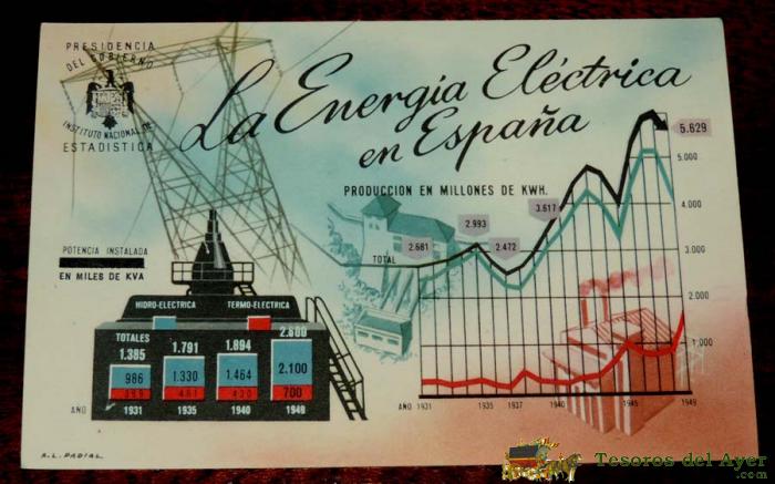 POSTAL DEL INSTITUTO NACIONAL DE ESTADÍSTICA, LA ENERGIA ELECTRICA EN ESPAÑA, AÑO 1949, E. I.G. VALVERDE, NO CIRCULADA.