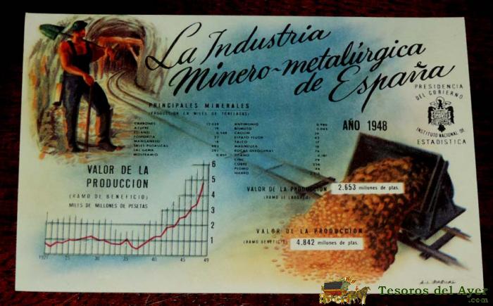 POSTAL DEL INSTITUTO NACIONAL DE ESTADÍSTICA, LA INDRUSTRIA MINERO-METALURGICA DE ESPAÑA, AÑO 1948, E. I.G. VALVERDE, NO CIRCULADA.