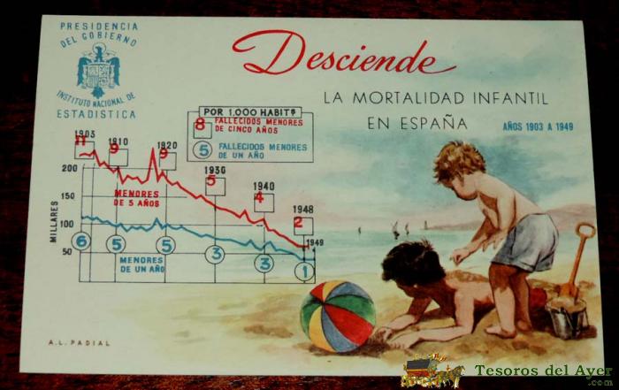 POSTAL DEL INSTITUTO NACIONAL DE ESTADÍSTICA, DESCIENDE LA MORTALIDAD INFANTIL EN ESPAÑA, AÑO 1949, E. I.G. VALVERDE, NO CIRCULADA.