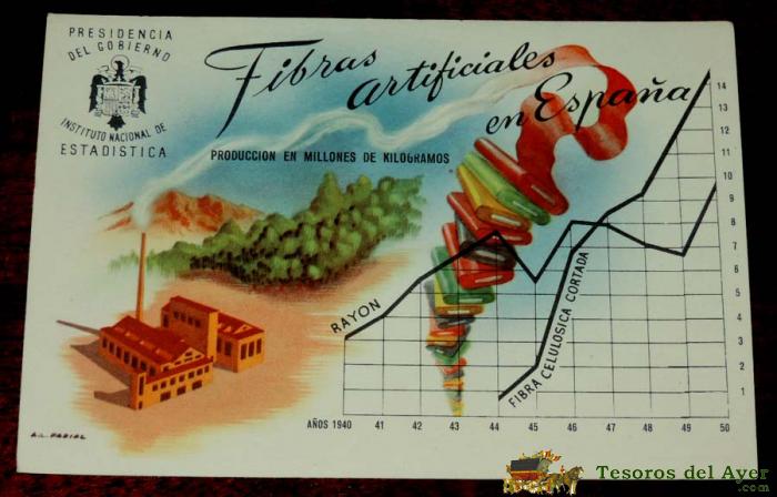 POSTAL DEL INSTITUTO NACIONAL DE ESTADÍSTICA, FIBRAS ARTIFICIALES EN ESPAÑA, AÑOS 1940, E. I.G. VALVERDE, NO CIRCULADA.