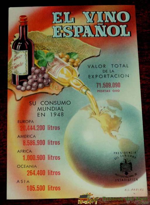 POSTAL DEL INSTITUTO NACIONAL DE ESTADÍSTICA, EL VINO ESPAÑOL, SU CONSUMO MUNDIAL, AÑOS 1948, E. I.G. VALVERDE, NO CIRCULADA.