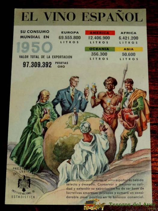 POSTAL DEL INSTITUTO NACIONAL DE ESTADÍSTICA, EL VINO ESPAÑOL, SU CONSUMO MUNDIAL EN 1950, E. I.G. VALVERDE, NO CIRCULADA.