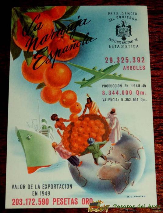 POSTAL DEL INSTITUTO NACIONAL DE ESTADÍSTICA, LA NARANJA ESPAÑOLA, VALOR DE LA EXPORTACION EN 1949, E. I.G. VALVERDE, NO CIRCULADA.