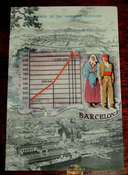 POSTAL DEL INSTITUTO NACIONAL DE ESTADÍSTICA, CRECIMIENTO DE LAS GRANDES CIUDADES, BARCELONA 1949, E. I.G. VALVERDE, NO CIRCULADA.