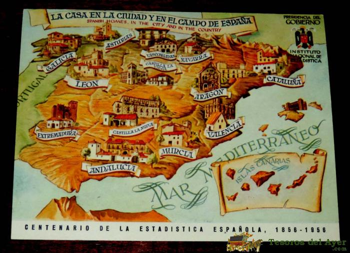 POSTAL DEL INSTITUTO NACIONAL DE ESTADÍSTICA, LA CASA EN LA CIUDAD Y EN EL CAMPO DE ESPAÑA, AÑO 1956, E. I.G. VALVERDE, NO CIRCULADA.