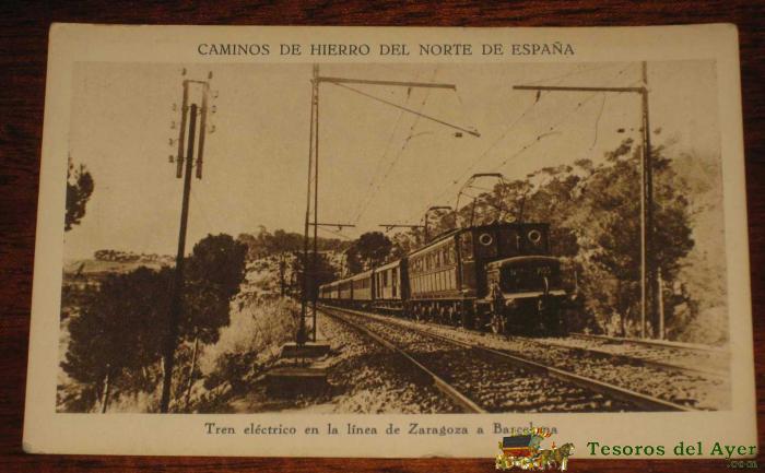 ANTIGUA POSTAL DE CAMINOS DE HIERRO DEL NORTE DE ESPAÑA - TREN ELECTRICO EN LA LINEA DE ZARAGOZA A BARCELONA - HUECOGRABADO MUMBRU, SIN CIRCULAR