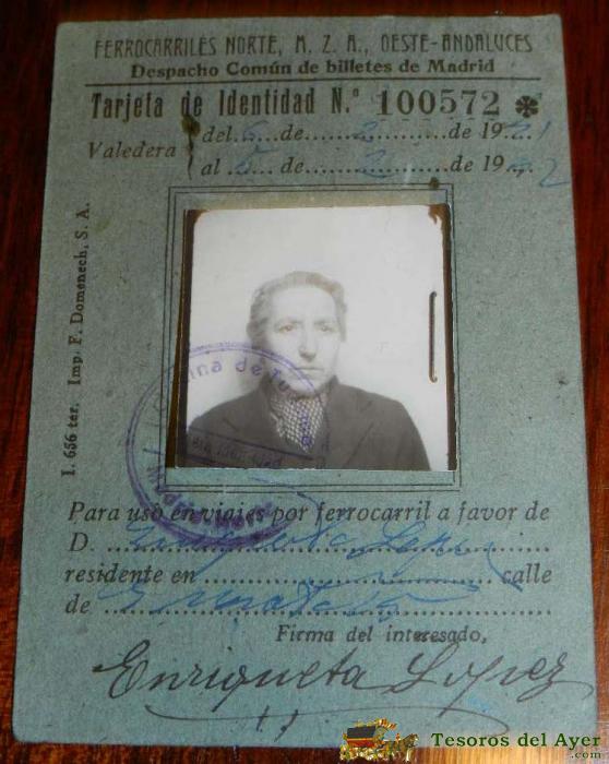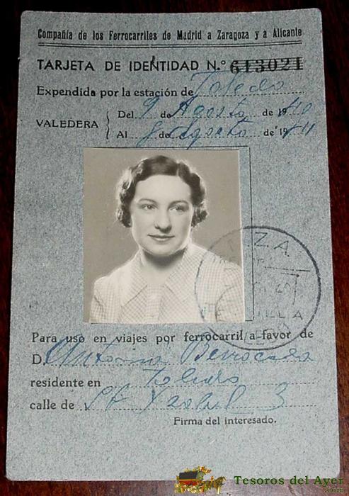ANTIGUA TARJETA DE IDENTIDAD DE LA COMPAÑIA DE LOS FERROCARRILES DE MADRID A ZARAGOZA Y ALICANTE - AÑO 40 / 41 - MIDE 12 X 8 CMS.