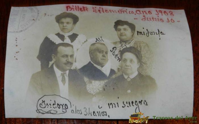 ANTIGUA FOTOGRAFIA ALBUMINA DE FAMILIA, BILLETE KILOMETRICO AÑO 1908 / 10, CON SELLO EN AZUL DE CAMINOS DE HIERRO DEL NORTE, MIDE 10,5 X 7 CMS.