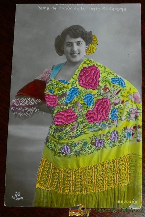 ANTIGUA FOTO POSTAL DE LA ARTISTA MATILDE GOMEZ, DAMA DE HONOR DE LA FIESTA MI-CAREME, ED. M.P. MADRID 158/2496. NO CIRCULADA. CON BORDADO EN HILO.