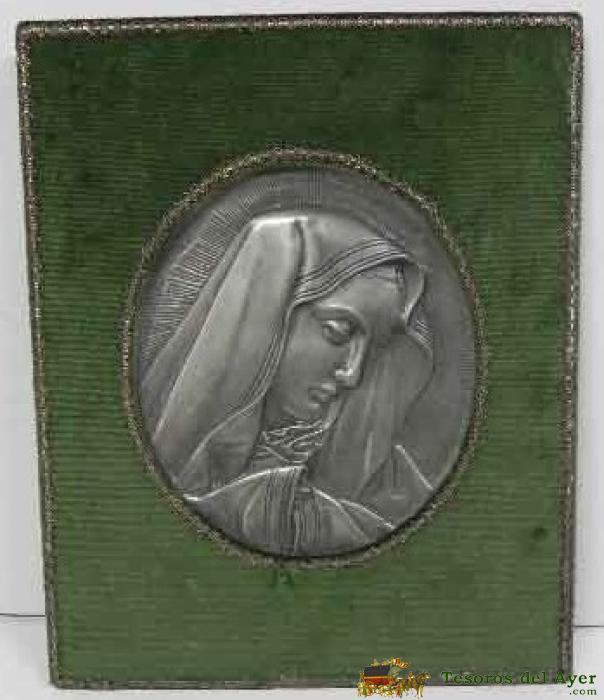 ANTIGUO CUADRO CON IMAGEN DE METAL Y EN RELIEVE DE LA VIRGEN - FORRADO EN TERCIOPELO Y CON FILIGRANA POR EL BORDE - MIDE 42 X 34 CMS.