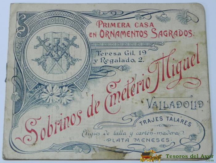 ANTIGUO CATALOGO DE LA PRIMERA CASA EN ORNAMENTOS SAGRADOS, SOBRINOS DE EMETERIO MIGUEL, VALLADOLID, 4 PAG, CON FOTOGRAFIAS DE IMAGENES MAS LISTA DE PRECIOS EN LAS PORTADAS POR EL INTERIOR, MIDE 15 X 12 CMS.