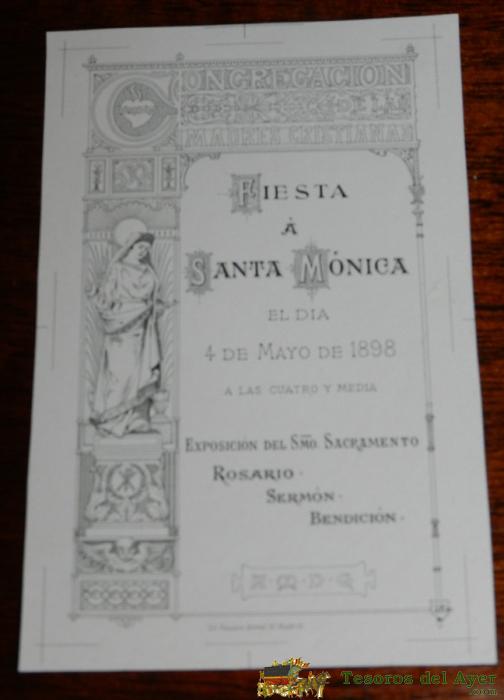 ANTIGUA LITOGRAFIA DE LA CONGREGACION DE LAS MADRES CRISTIANAS, FIESTA A SANTA MONICA, EL DIA 4 DE MAYO DE 1898, LIT. PALACIOS ARENAL, MADRID, MIDE 14 X 9 CMS.