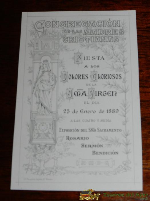 ANTIGUA LITOGRAFIA DE LA CONGREGACION DE LAS MADRES CRISTIANAS, FIESTA A LOS DOLORES GLORIOSOS DE LA SANTA VIRGEN, EL DIA 25 DE ENERO DE 1889, LIT. PALACIOS ARENAL, MADRID, MIDE 14 X 9 CMS.