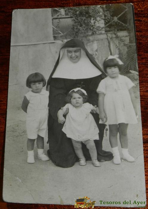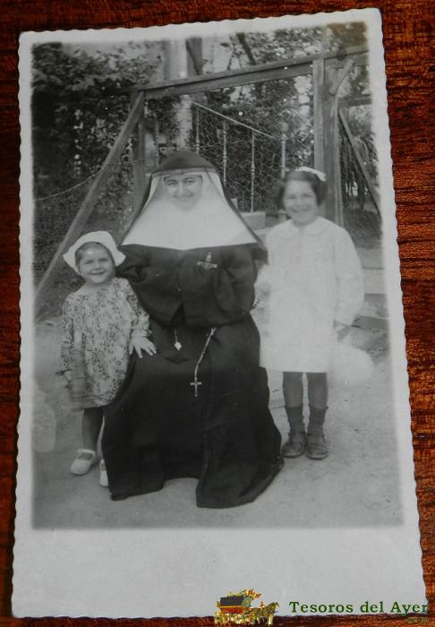ANTIGUA FOTO POSTAL DE MONJA O RELIGIOSA JUNTO CON DOS ALUMNAS DEL COLEGIO, ESCRITA POR EL REVERSO, NO CIRCULADA.