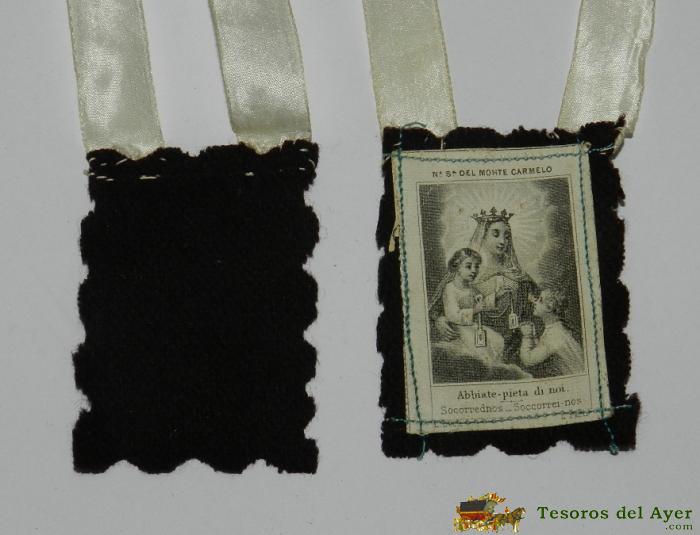 ANTIGUO ESCAPULARIO, DE NUESTRA SEÑORA DEL MONTE CARMELO, MIDE CADA CUADRO 8,5 X 7 CMS. EN TELA.