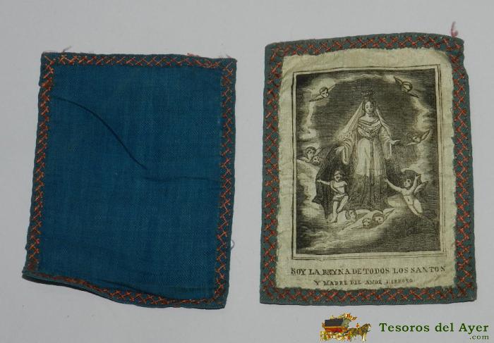 ANTIGUO ESCAPULARIO, DE SOY LA REINA DE TODOS LOS SANTOS, Y MADRE DEL AMOR HERMOSO, MIDE CADA CUADRADO 11 X 8,5 CMS. EN TELA.