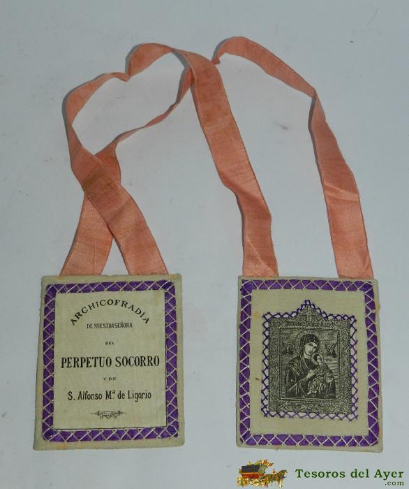 ANTIGUO ESCAPULARIO ARCHICOFRADIA DE NUESTRA SEÑORA DEL PERPETUO SOCORRO Y DE S. ALFONSO M. DE LIGORIO, MIDE 10 X 8,2 CMS. EN TELA.