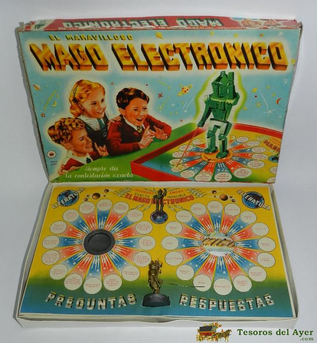 ANTIGUO JUEGO - EL MARAVILLOSO MAGO ELECTRONICO -AÑOS 50 - PREGUNTAS Y RESPUESTAS - CON UN ROBOT QUE GIRA ACERTANDO - MIDE 40 X 25 X 4 CMS.