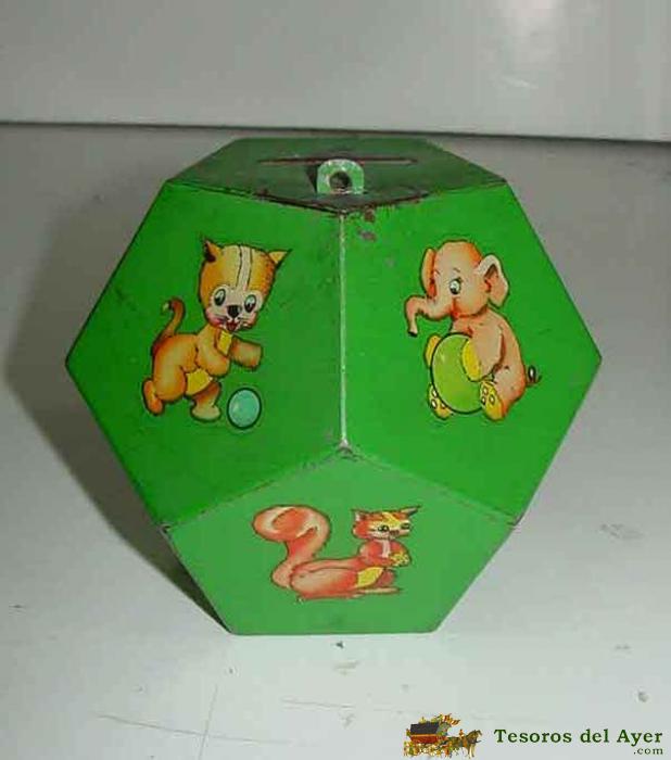 ANTIGUA HUCHA METALICA INFANTIL CON FORMA DE DODECAEDRO (DODECAEDRO ES UN POLIEDRO DE DOCE CARAS), ILUSTRACIONES CON ANIMALITOS - EXCELENTE ESTADO DE CONSERVACION, MIDE 10 CMS. DE ALTURA, TAL COMO SE VE EN LAS FOTOGRAFIAS