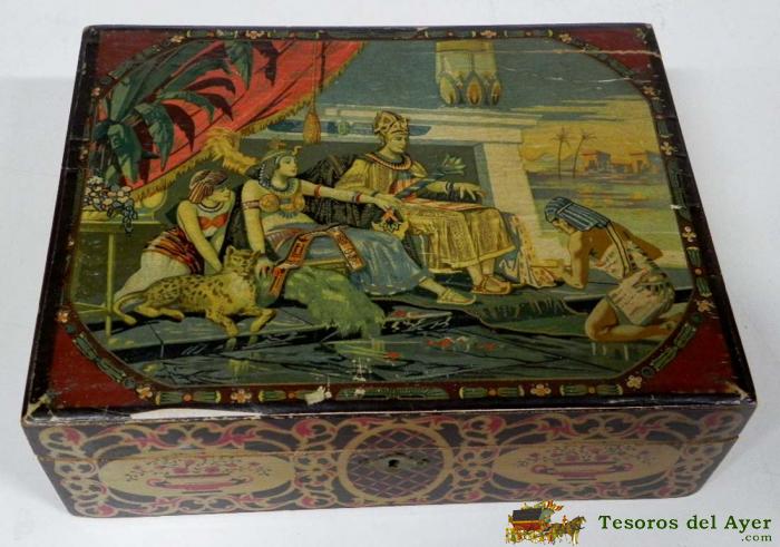 ANTIGUA CAJA DE MADERA PARA LAS LABORES DE LOS NIñOS, CON PRECIOSA ILUSTRACION DE MOTIVOS EGIPCIOS, TIENE UN ESPEJO EN LA CONTRA-TAPA, MIDE 29 X 22,5 CMS.