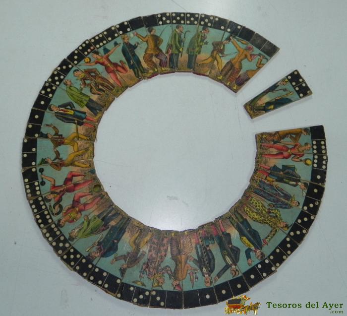 ANTIGUO DOMINO INFANTIL COLECCIÓN COMPLETA DE SUS 28 FICHAS, ILUSTRACIONES DE CIRCO, AÑO 1910 ES DOMINÓ Y PUZZLE A LA VEZ. BUEN ESTADO. TAMAÑO CROMO 9,5 X 4 CM. APROXIMADAMENTE, PRECIOSO.