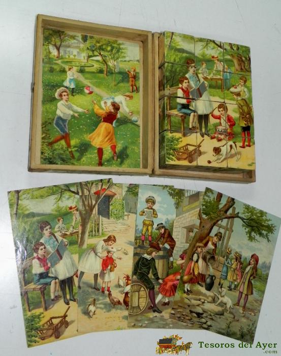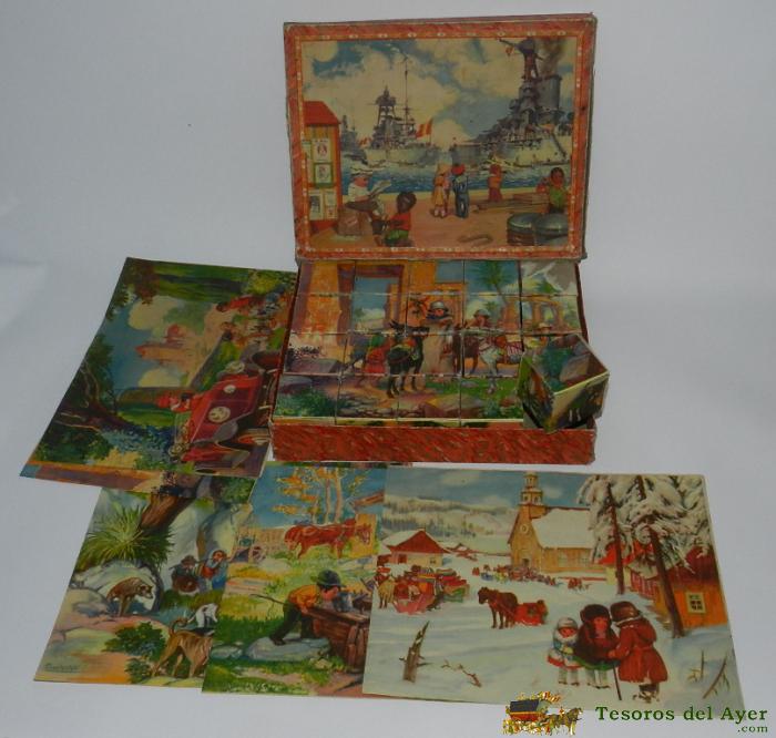ANTIGUO ROMPECABEZAS INFANTIL, LITOGRAFIADO, CUBOS DE CARTON, CON SU CAJA ORIGINAL DE MADERA Y SUS LAMINAS, BUEN ESTADO DE CONSERVACION, LA CAJA MIDE 19,5 X 15 X 5 CMS.