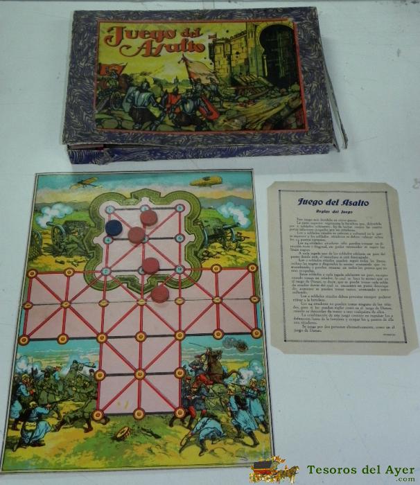 ANTIGUO JUEGO DEL ASALTO, DE BORRAS AñOS 30, CON SUS INTRUCCIONES, A LA TAPA LE FALTAN ALGUN LATERAL, SE PUEDE REFORZAR CON CARTON FACILMENTE. MIDE 31,5 X 22 CMS.