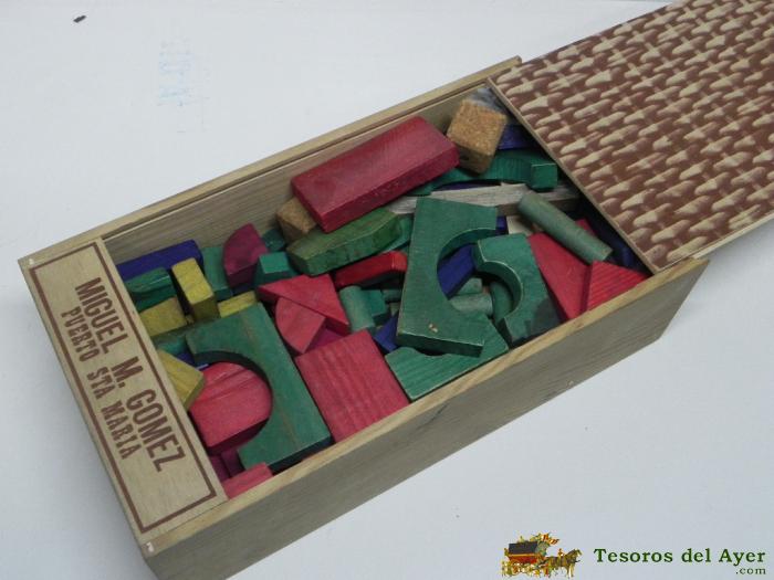 ANTIGUA CAJA DE CONSTRUCCIONES DE MADERA DE MIGUEL M. GOMEZ, PUERTO DE SANTA MARIA, MIDE 32,5 X 18 X 9 CMS. MUCHISIMAS PIEZAS, TAL COMO SE VE EN LAS FOTOS.