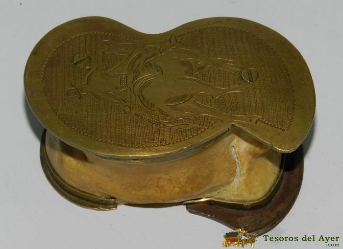 ANTIGUA TABA DE VACA REFORZADA CON LATON, SE TRATA DE UN JUEGO ARGENTINO, EL CAMPECHANO, MIDE 9 X 5,5 X 4,3 CMS. MUY ANTIGUA Y CON GRABADOS EN EL LATON.