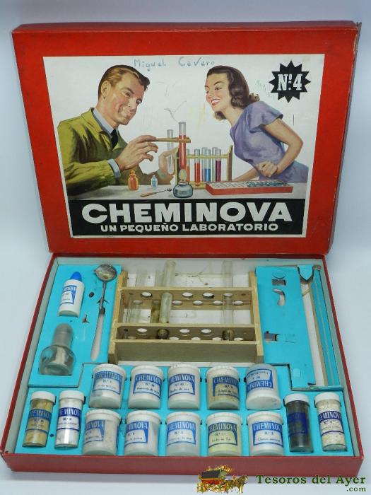 ANTIGUO JUEGO CHEMINOVA UN PEQUEÑO LABORATORIO, N.4, TODOS LOS BOTES TIENEN EL CONTENIDO, BASTANTE COMPLETO, AUNQUE COMO SE PUEDE VER EN LAS FOTOGRAFIAS LE FALTAN COSAS, MIDE 40 X 31 CMS.