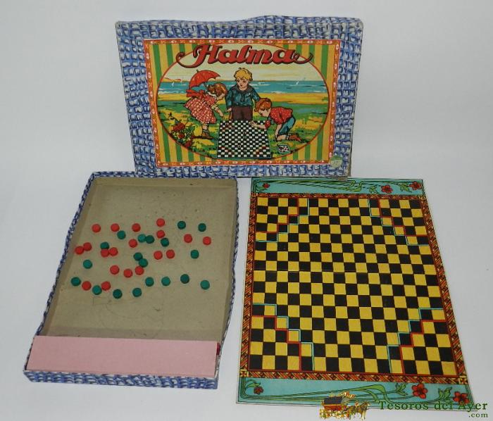 ANTIGUO JUEGO DE MESA DE ENRIQUE BORRAS MATARO, HALMA, BUEN ESTADO AÑOS 40, MIDE 32 X 22 CMS. CONTIENE TABLERO DIPTICO, CON 19 FICHAS VERDES Y 19 ROJAS.