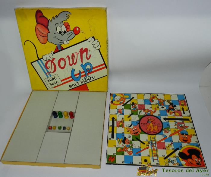 JUEGO DE MESA INFANTIL DOWN & UP, BAJA Y SUBE, DE WALT DISNEY CON SUS PERSONAJES CLáSICOS, DE MANUFACTURA DE JUGUETES M. BARTRéS. CON 4 PEONES Y CINCO DADOS. AñOS 50-60. LA CAJA MIDE 35 X 35 X 3 CM.