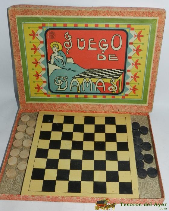 ANTIGUO JUEGO DE DAMAS, MUY ANTIGUO CON 12 FICHAS BLANCAS Y 11 NEGRAS, REALIZADAS EN MADERA, LA CAJA MIDE 27,5 X 20 CMS.