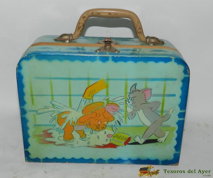 CABAS ESCOLAR DE TOM Y JERRY, DE MADERA, EN EXCELENTE ESTADO MIDE 22 X 16 X 7,5 CMS. TAL COMO SE VE EN LAS FOTOGRAFIA PUESTAS.1957 LOEW´S INC. LE FALTA EL ENGANCHE DEL CIERRE