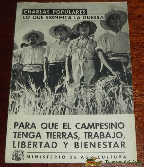 FOLLETO GUERRA CIVIL. CHARLAS POPULARES, LO QUE SIGNIFICA LA GUERRA, MINISTERIO DE AGRICULTURA, PARA QUE EL CAMPESINO TENGA TIERRAS, TRABAJO LIBERTAD Y BIENESTAR, 14 PAG. 17 X 12 CM. EDICIONES ESPAÑOLAS, EXCELENTE ESTADO DE CONSERVACION. LAS PAGINAS ESTAN