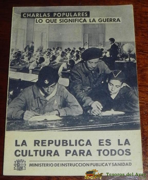 FOLLETO GUERRA CIVIL. CHARLAS POPULARES, LO QUE SIGNIFICA LA GUERRA, MINISTERIO DE INSTRUCCION PUBLICA Y SANIDAD, LA REPUBLICA ES LA CULTURA PARA TODOS, 14 PAG. 17 X 12 CM. EDICIONES ESPAÑOLAS, EXCELENTE ESTADO DE CONSERVACION.