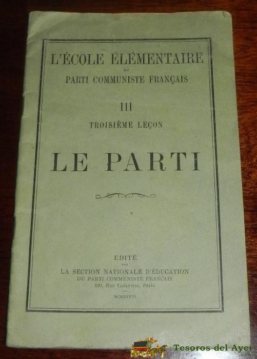 FOLLETO GUERRA CIVIL - 1936 - LE PARTI, III LECON, L´ECOLE ELEMNTAIRE DU PARTI COMMUNISTE FRANCAIS, EDITE PAR LA SECTION NATIONALE D´EDUCATION DU PARTI COMUNISTE FRANCAIS, 31 PAGINAS, MIDE 21 X 13,5 CMS. ESTE LIBRO ESTABA DENTRO DE UNA COLECCION DE MANUAL